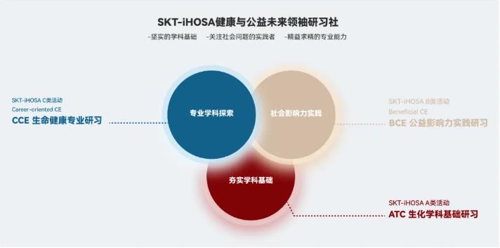 SKT-IHOSA三大研习类别一一ATC,生化学科基础研习、BCE 公益影响力实践研习、CCE 生命健康专业研习,面向不同学习及发展阶段的学生,打造专属的进阶式成长路径助力学生全面发展。