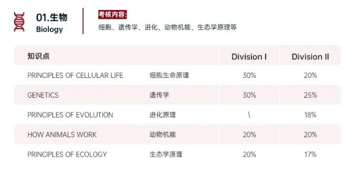 Division l 30%;Division ll 20%;遗传学:Division l 30%;Division ll 25%;生物进化:Division ll 15%;植物学:Division l 20%;Division ll 20%;动物学:Division l 20%;Division ll 20%;